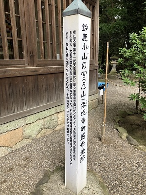 倭姫命は一般的に訪れた地の有力者に、「汝の国の名は何ぞ」と問うと、有力者はこの地の特色を付け名前を答えている。例えば、この亀山の地での有力者は「味酒(うまさけ)鈴鹿の国の奈具波志忍山」と答えている。そこで有力者は神宮(かむみや)を造り天照大神を祀り、さらに神田と神戸を献上したのである。