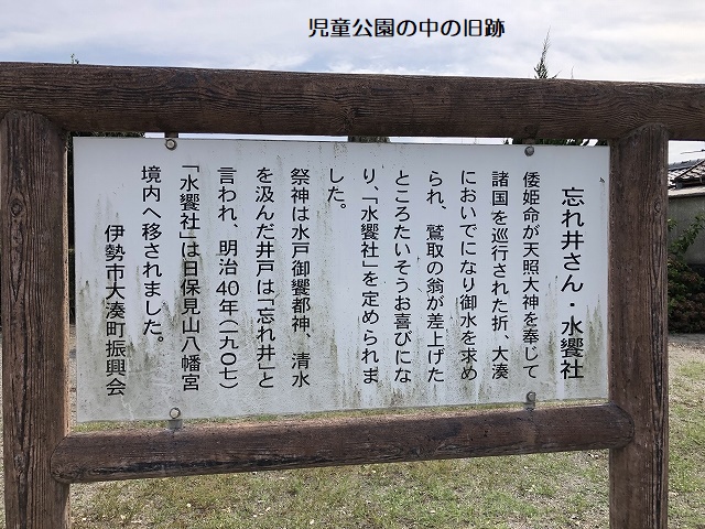 一つは伊勢市大湊町「水饗(みあえ)神社」で、美味しい水は下記写真の「忘れ井」から汲みだされたとされる。