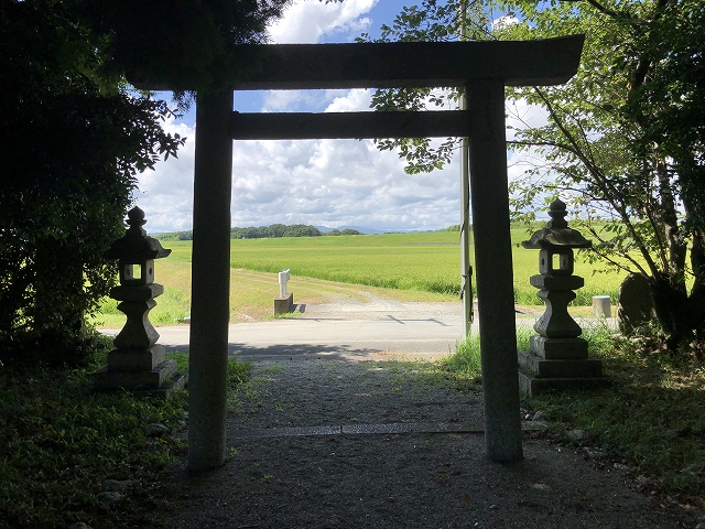 櫛田川周辺の田圃の黄緑が映えて、思わず神社の中から鳥居越しの景色をカメラに納めた。