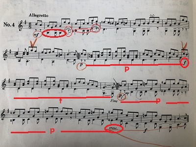 No.6(Allegretto)復習 最初からフォルテまでクレシェンドを正確に最後の小節はアポヤンドがいい。3段目も同じ