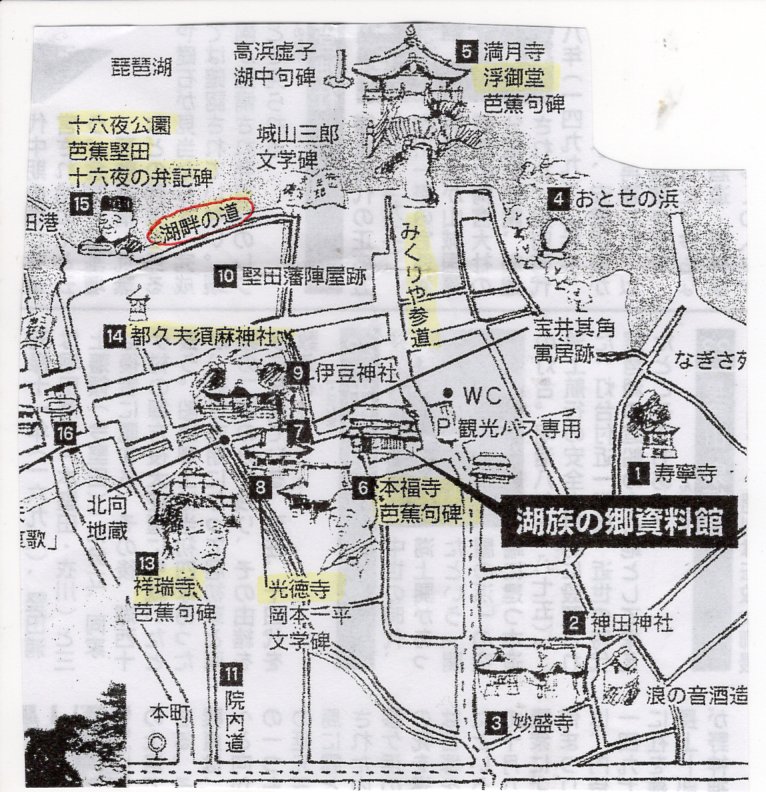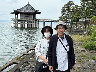 そして、再び浮御堂の前まで来て、「私は琵琶ゲンゴロウと申します。今から打合せがあります。この店のお茶がおいしいですよ。」とおっしゃって、お礼をお伝えする暇もなく去っていった。喉が渇いたのでそのお店に入って、ボランティアのお話をしたら、「池上さんですよ。いい方ですよ。83歳ですかね。」