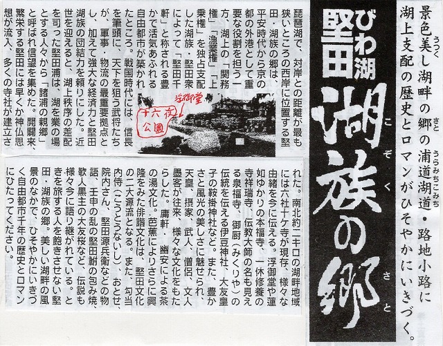 (景色美し湖畔の郷の浦道湖道・路地小路に湖上支配の歴史とロマンがひそやかにいきづく。パンフレットから)
