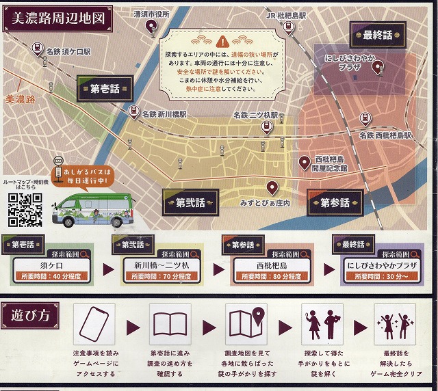 正解であれば次の指定場所に行くのであるが、下図を見てわかることだが、結局名鉄の駅3つ分を歩きながら14カ所で謎解きをするウォーキングを兼ねたものである。