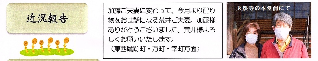 今までの世話人としての活動(本堂の五色の布張り、本堂の乾拭き、境内や墓の除草などの環境整備)の他に、新たに天然寺の寺報や浄土宗新聞を配ることになった。
