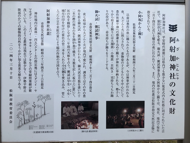 後、この神社は伊勢国司北畠満雅が阿坂山に砦を築く時に社地を山から移したのが、阿射加神社(大阿坂)である。