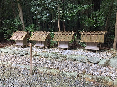 その右側の小さな4つの祠が並んでいる。地元の神である伊佐波登美命(いざわとみのみこと)とその子孫をお祀りしている。