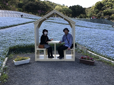 ♬ 春うららネモフィラブルーの農園にシルバーカー押す母と一枚