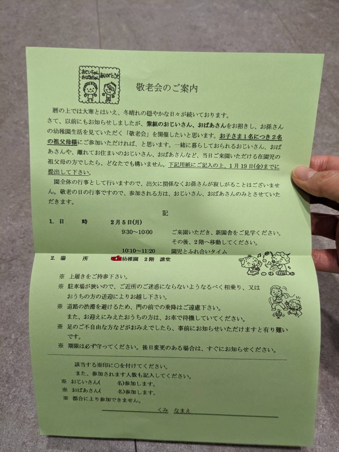 幼稚園主催の敬老会の案内が来た。