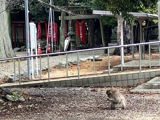 おい猿ちゃん!後ろの建物は神社にあるけど地域の公民館だ。