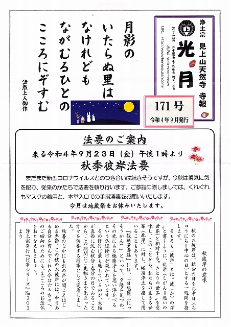 コロナ禍ではあるが、今回の秋彼岸法要は従来のかたちで行うという。(寺報 171号)