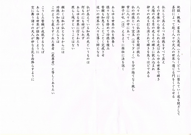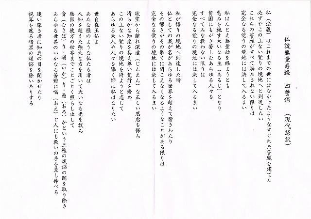②浄土宗は仏説無量寿経の四誓偈を唱えるが、今回初めて現代語訳で唱えた。